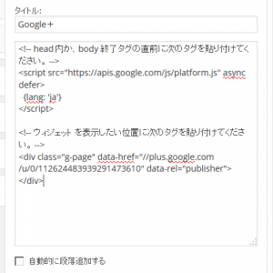 Google+ バッジ PR 2014/11/7 シェアする LINE! Simplicityの特徴 › フォーラム › Simplicityについての質問 › Google+ バッジ このトピックには5件の返信、2人の参加者があり、最後にわいひらにより11年、 5ヶ月前に更新されました。 5件の返信スレッドを表示中 投稿者 投稿 2014年11月7日 6:19 PM #6080 もくゲスト Google+ バッジをサイドバーに付けようと、 サイドバーウィジェットのテキスト内にウィジェットのタグを入れ、 jsファイルを、 header.phpでは、</head>の直前に、 footer.phpでは、</body>の直前に入れてみたのですが、表示さえされませんでした。 方法を教えて頂けるとありがたいです。 WordPress初心者です。よろしくお願いいたします。 2014年11月7日 6:33 PM #6084 わいひらキーマスター 取り付けようと思っているGoogle+バッジのURLを貼ってもらってもよろしいでしょうか? 2014年11月7日 6:53 PM #6088 もくゲスト 早速のご返事ありがとうございます。 こちらになります。 <!– head 内か、body 終了タグの直前に次のタグを貼り付けてください。 –> <script src=”https://apis.google.com/js/platform.js” async defer> {lang: ‘ja’} </script> <!– ウィジェット を表示したい位置に次のタグを貼り付けてください。 –> <div class=”g-page” data-href=”//plus.google.com/私のID” data-theme=”dark” data-rel=”publisher”></div> よろしくお願いいたします。 2014年11月7日 8:56 PM #6107 わいひらキーマスター 僕がやっている別のブログでもバッジを使用しているのですが、そちらの方法を見返してみました。 そうしたら面倒くさいんで、テキストウイジェットに全部貼り付けて使っているようです。 それでもちゃんと動作しているので大丈夫かと思います。 Attachments:3280ff34e652aa3414c55f2d9af8699c.png 2014年11月7日 9:35 PM #6110 もくゲスト 出来ました。 そのパターンもやったはずなんですが、先程はできませんでした。 もしやと思い、フッターに入れるバージョンも試したら、今回はなぜか出来ました。 ちゃんとコピペしたつもりだったんですけど、出来てなかったんですかね?謎です。 何はともあれ、貴重な時間を割いて頂き、ありがとうございました。 お陰様で貼り付けることが出来ました。 2014年11月7日 10:05 PM #6121 わいひらキーマスター ちゃんとコピペしたつもりだったんですけど、出来てなかったんですかね?謎です。 もしかしたらそうかも。 なにはともあれ、表示できて良かったです。 投稿者 投稿 5件の返信スレッドを表示中 トピック「Google+ バッジ」には新しい返信をつけることはできません。