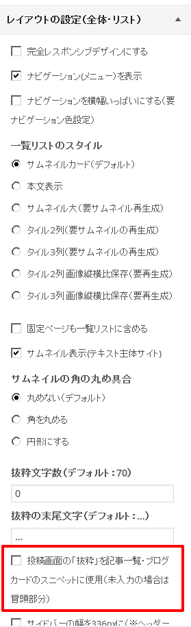 最新版を利用させていただいておりますが、件名の記事にありました「抜粋」を表示させるためのチェックボックス(「カスタマイズ」~「レイアウトの設定」)が見あたりません。