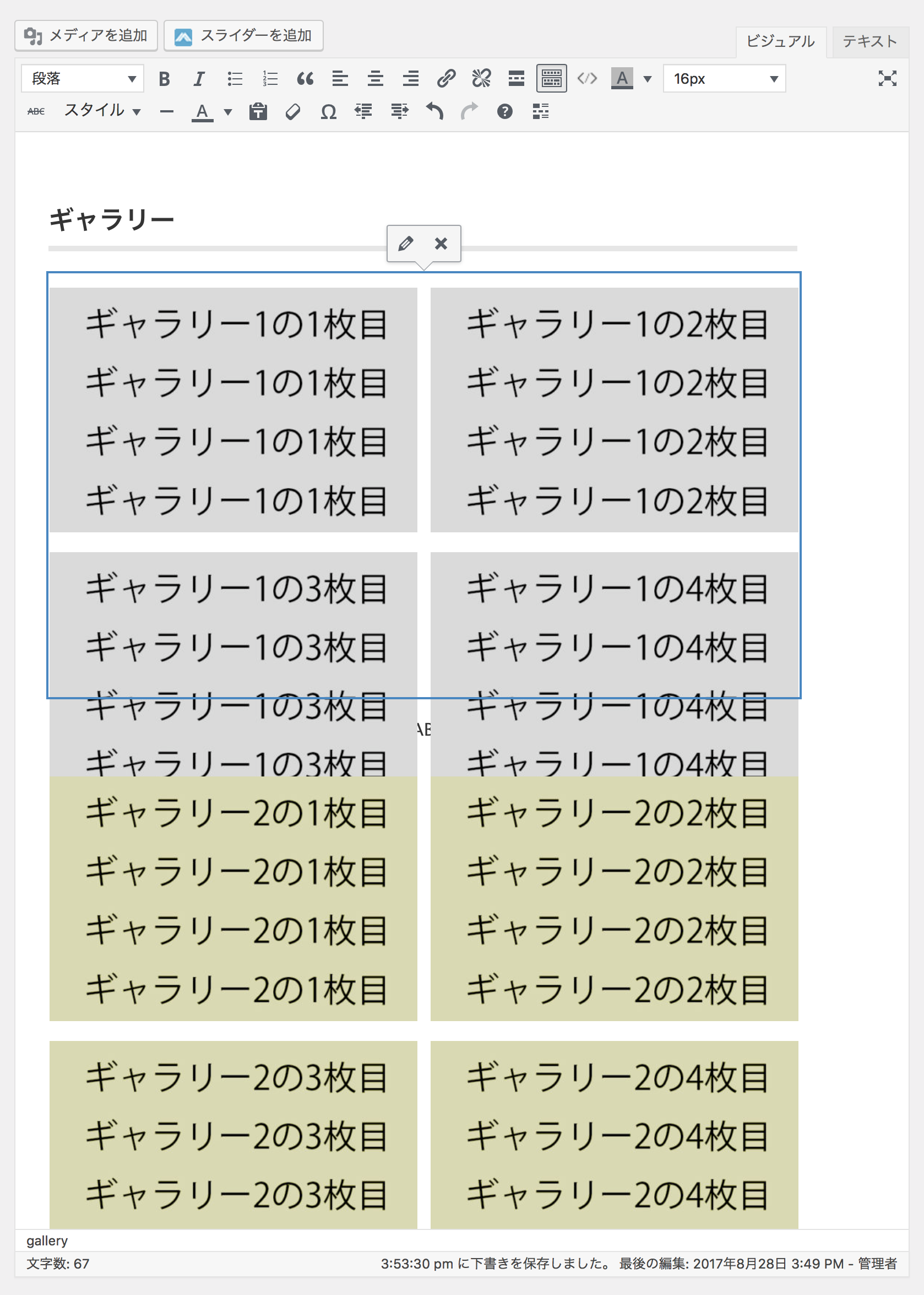 このスクリーンショットの例では、2つのギャラリーを置き、間に文字を入れていますが、1つ目のギャラリーの下に文字が隠れ、さらに2つ目のギャラリーが一番上に被ってしまっている状態です。